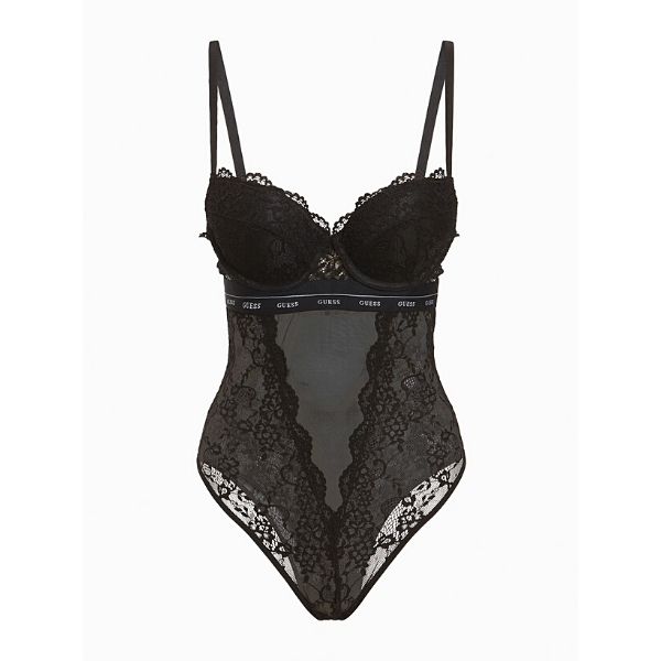 Csipkés, rugalmas anyagból készült női body. Állítható vállpántokkal, hátul akasztós rögzítéssel, középen elasztikus résszel, GUESS feliratokkal. Mélyen felvágott alsó résszel.