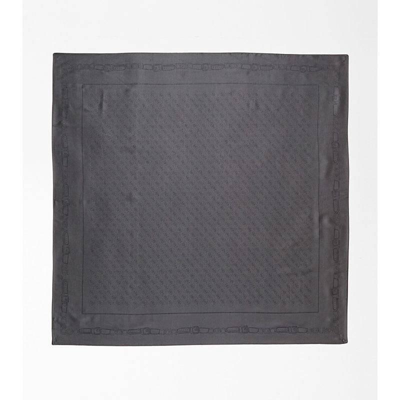 Halvány szürke, anyagában logó mintás női kendő.