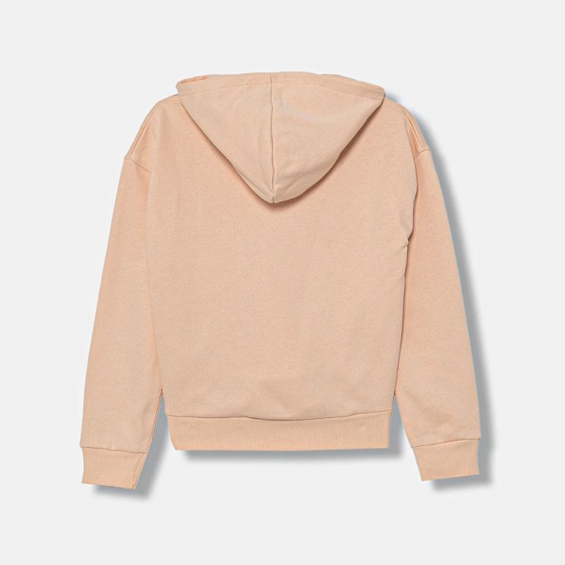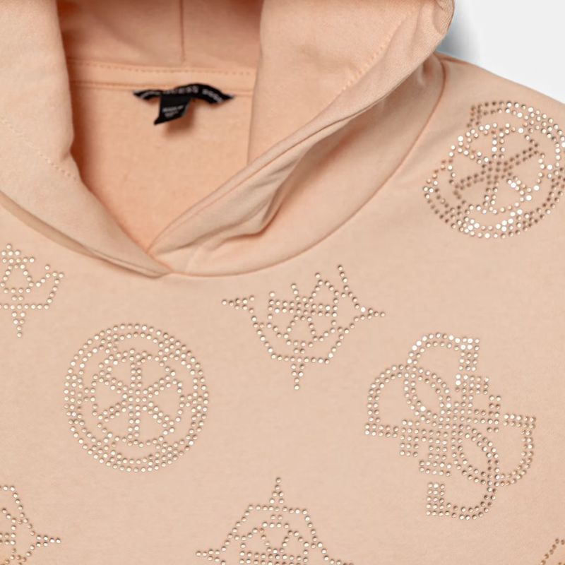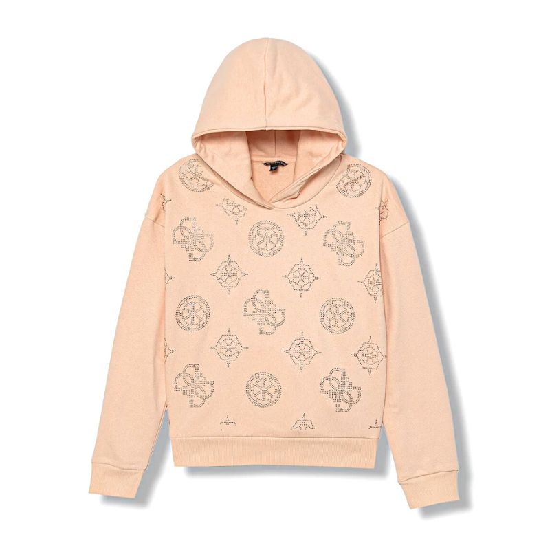 Pasztell rózsaszín kapucnis pulóver, elején strasszokkal kirakott logókkal.