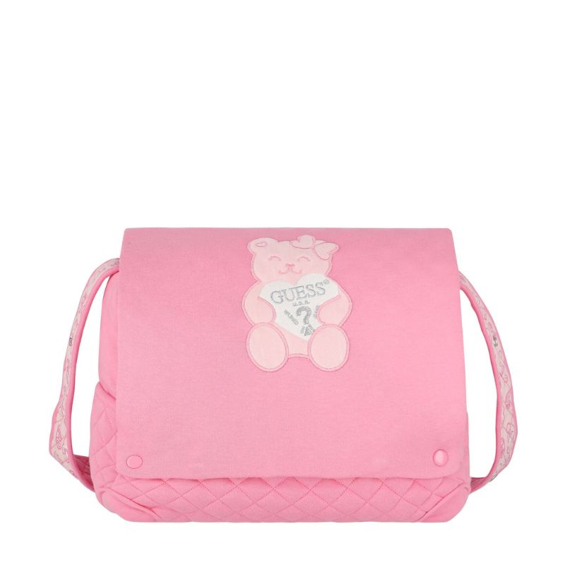 Nagy méretű pelenkázó táska pamutból. Praktikus segítség a mindennapokra, hogy minden fontos dolgod kéznél legyen gyermeked tisztán tartásához, és etetéséhez. Finom tapintású anyagból készült, elején kis rózsaszín macival. Belső része egyterű. A táskához tartozik egy pelenkázó alátét, és egy zsák is.