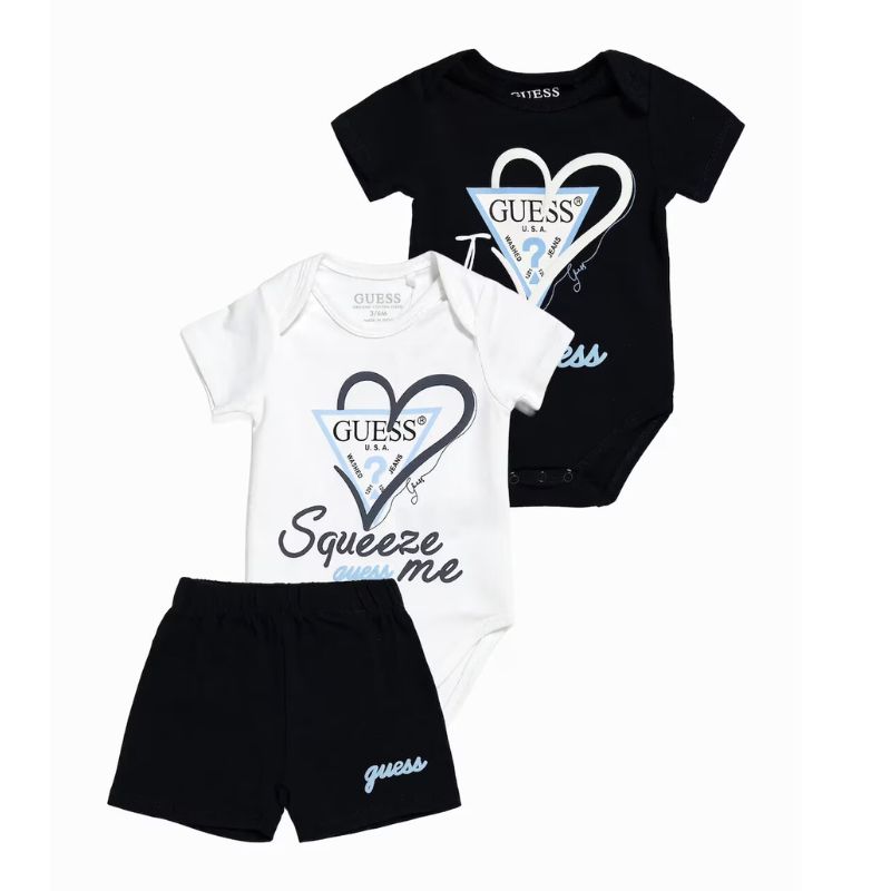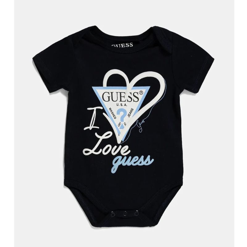 Mindkét body rugalmas anyagból készült, elején szívbe körvonalazott GUESS háromszög logókkal.