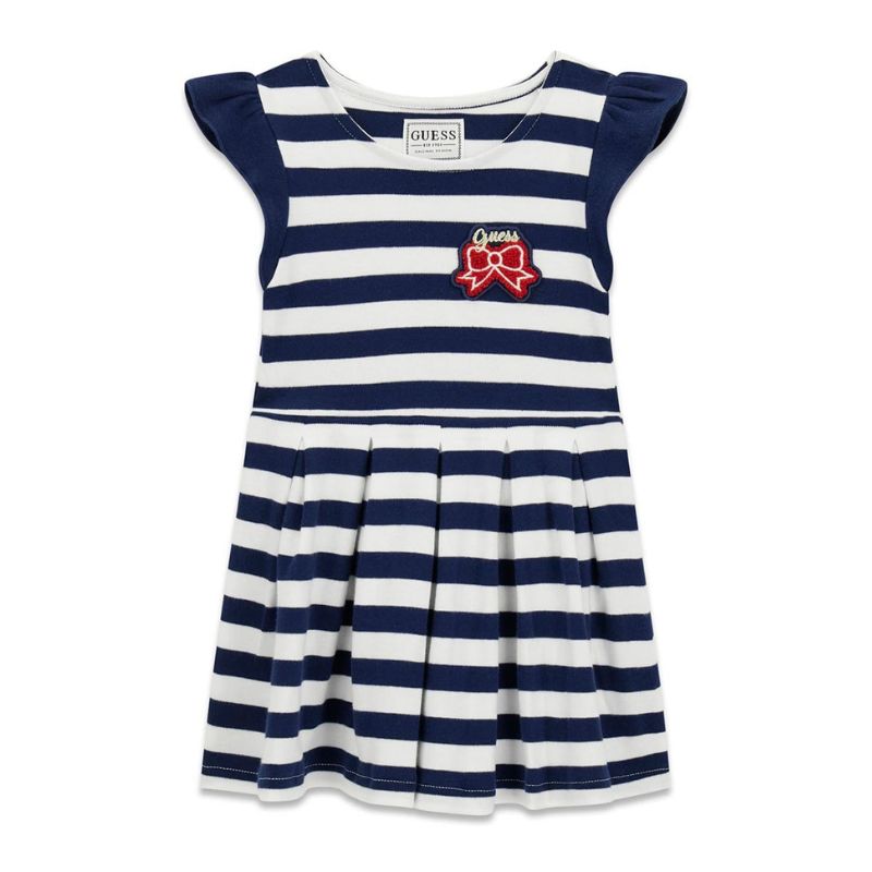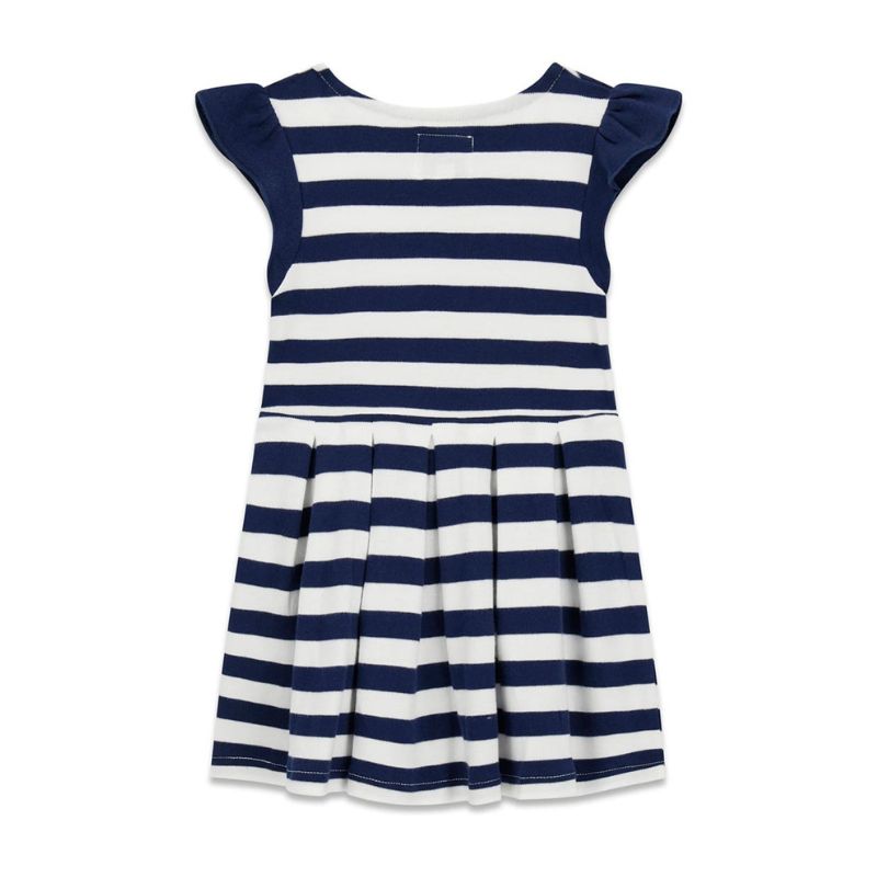 Fodros ujjú sötétkék-fehér csíkos ruha kislányoknak.
