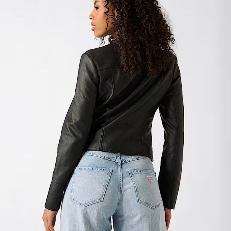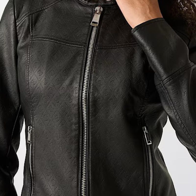 Egész anyagfelületén GUESS logó mintákkal nyomott női műbőr dzseki.