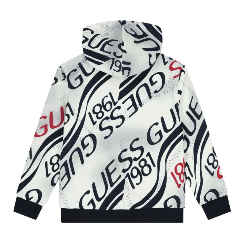 Nagy GUESS logó mintás kapucnis pulóver kenguruzsebekkel.