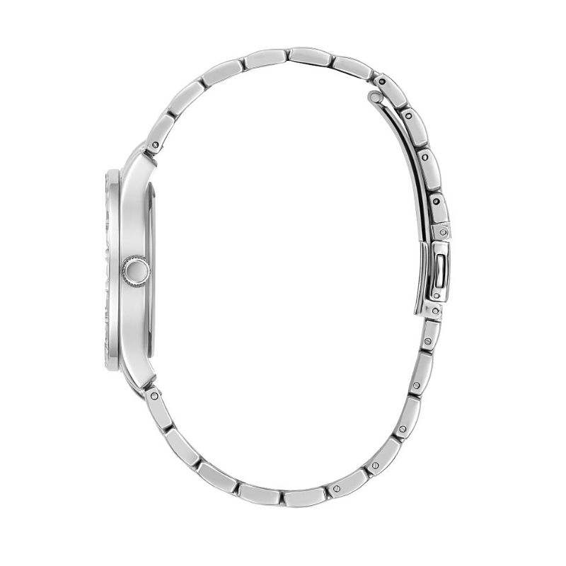 Az ezüst színű, csillogó kövekkel körberakott számlap kialakítása az ezüst színű nemesacélból készült szíjjal együtt tökéletesen alá tudja támasztani a nőiességet.