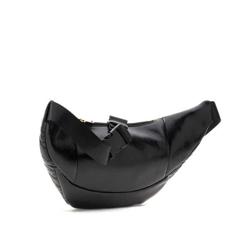 Fényes anyagfelületű, nagy méretű női utazó-övtáska.