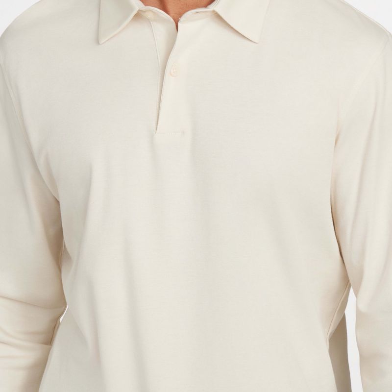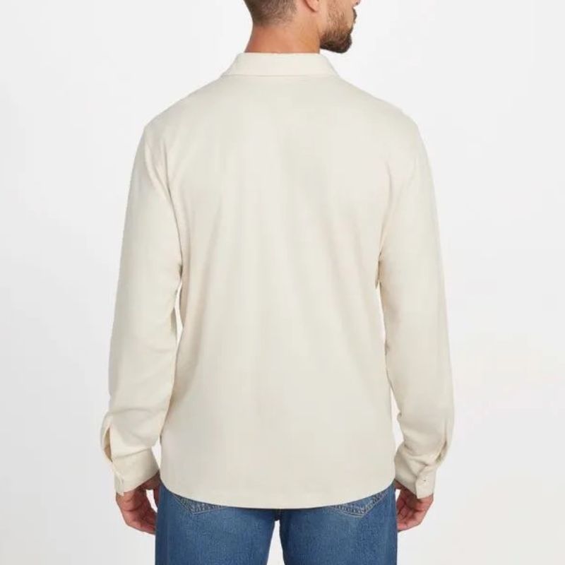 Elasztikus anyagú, hosszú ujjú pamut póló inggallérral és szegélyes ujjakkal.