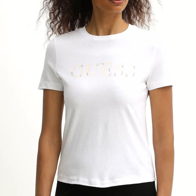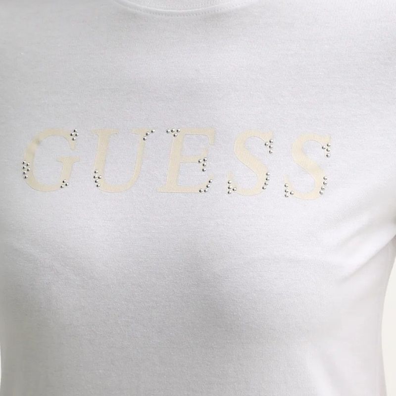 Fehér női póló, elején szegecsekkel díszített GUESS logóval.