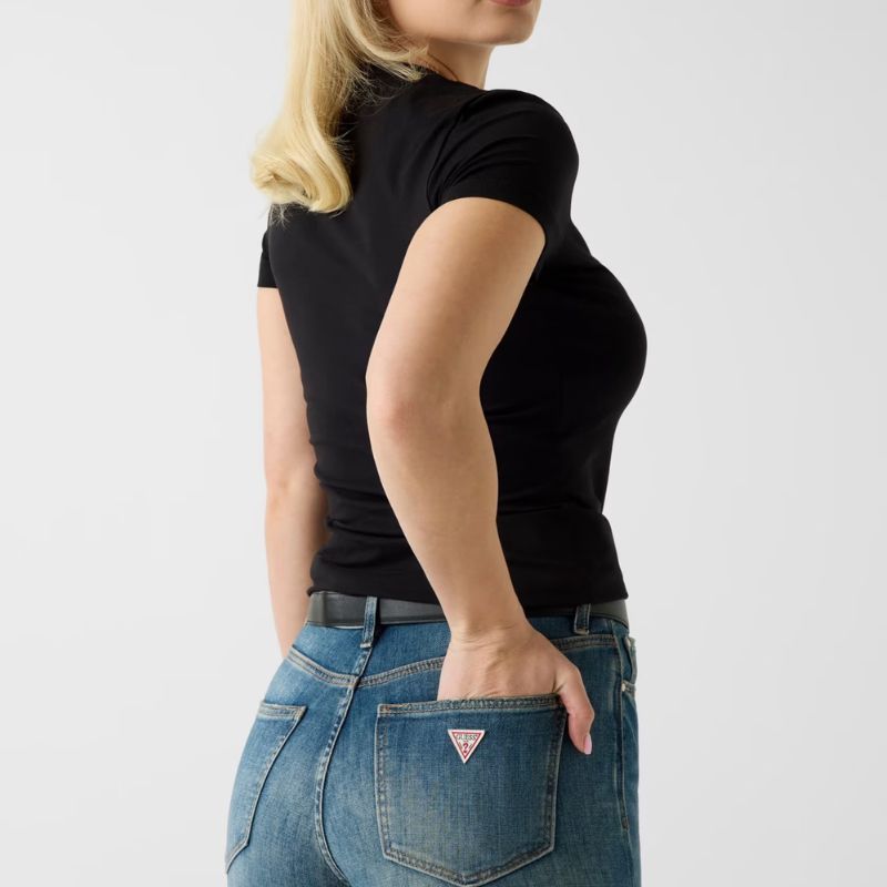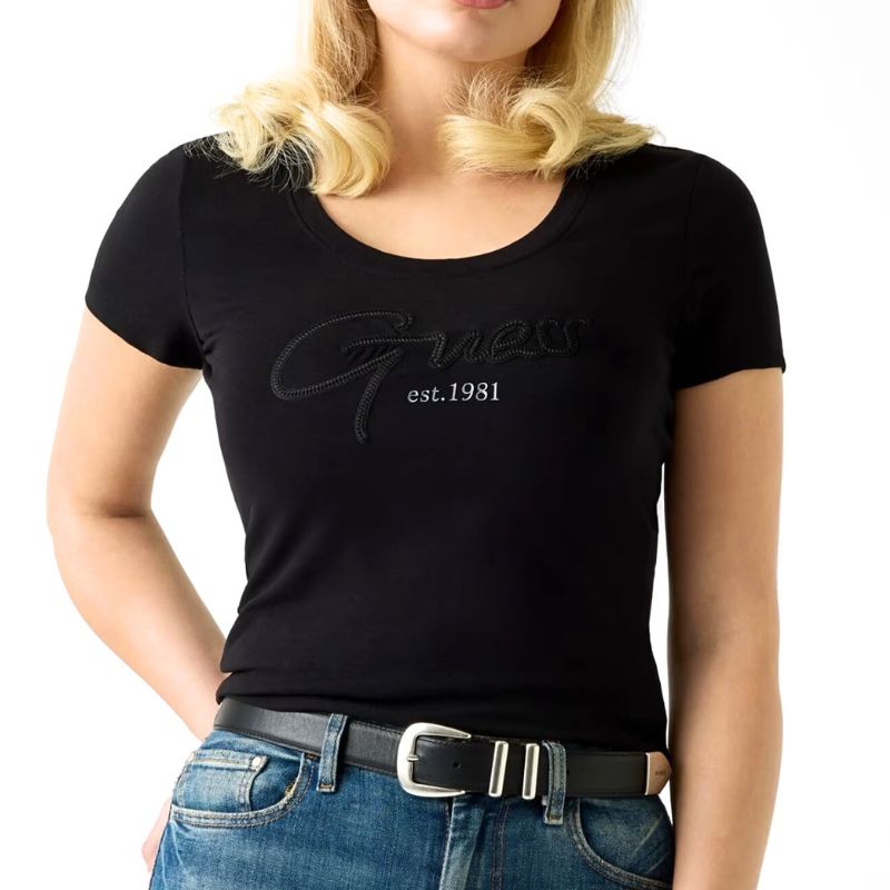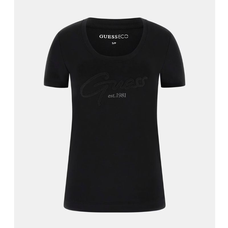 Rövid ujjú, kerek nyakkivágású slim fit póló, elején flitterekkel díszített GUESS felirattal.