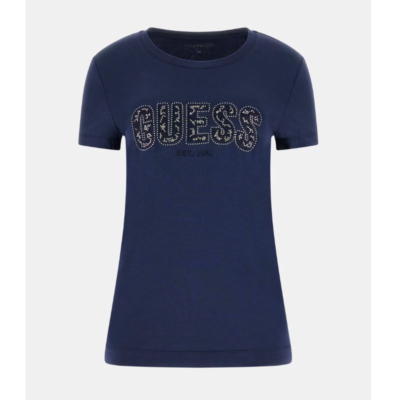 Elasztikus anyagú női póló, elején strasszokkal díszített, nagy GUESS logóval.
