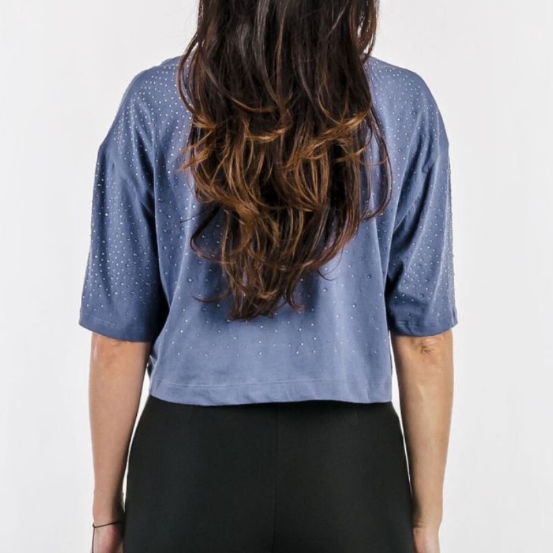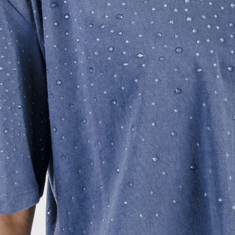 Puha anyagú, laza esésű női póló kövekkel díszítve.