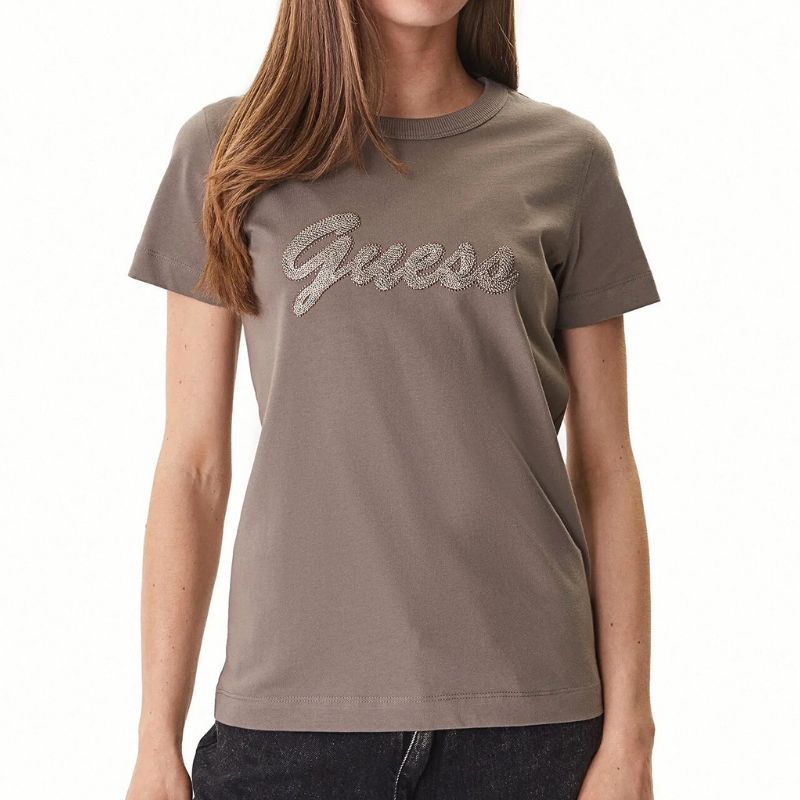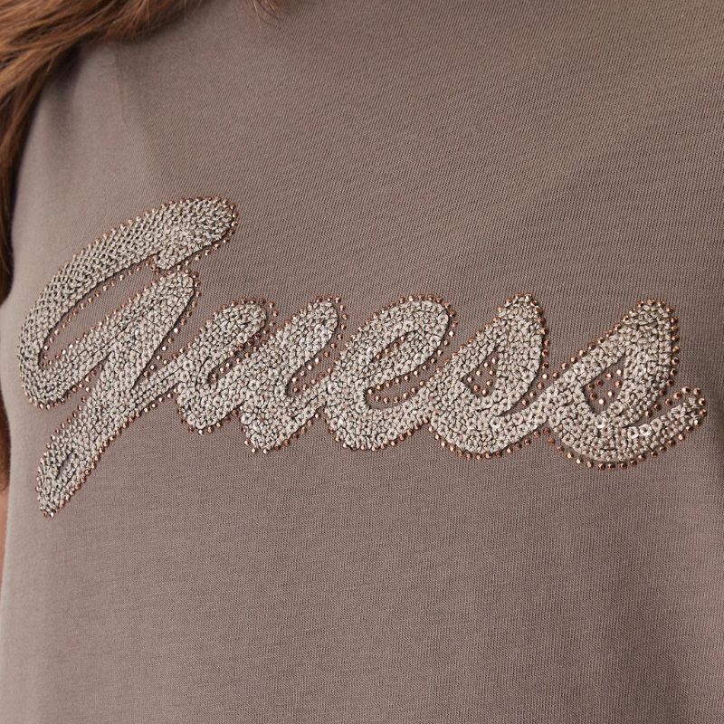 Rövid ujjú, regular fit szabású pamut póló, elején strasszokkal díszített GUESS logóval.