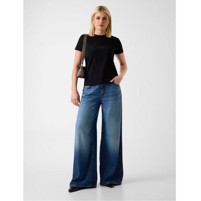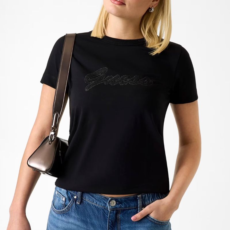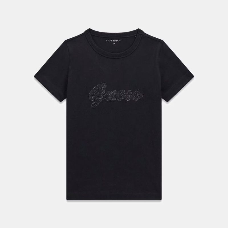 Rövid ujjú, regular fit szabású pamut póló, elején strasszokkal díszített GUESS logóval.