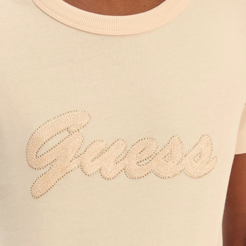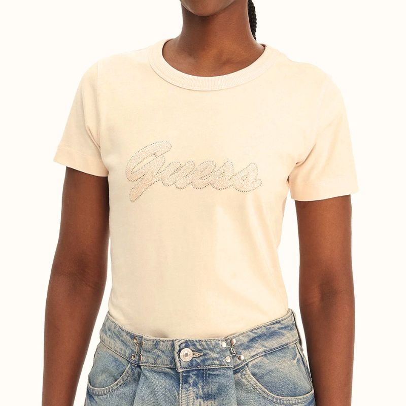 Rövid ujjú, regular fit szabású pamut póló, elején strasszokkal díszített GUESS logóval.