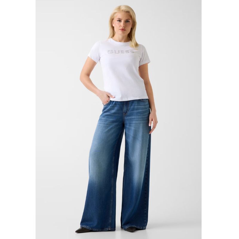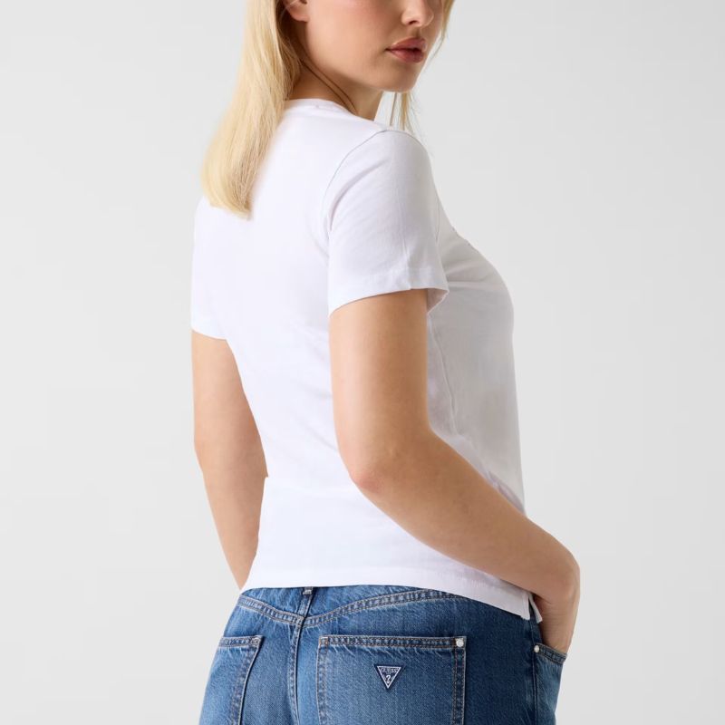 A GUESS logó kiemelkedik a mellkason, melyet fényes kövek alkalmazásával hoztak létre, amelyek elbűvölő és kifinomult érintést kölcsönöznek.