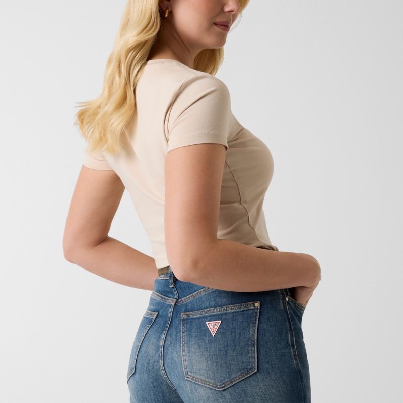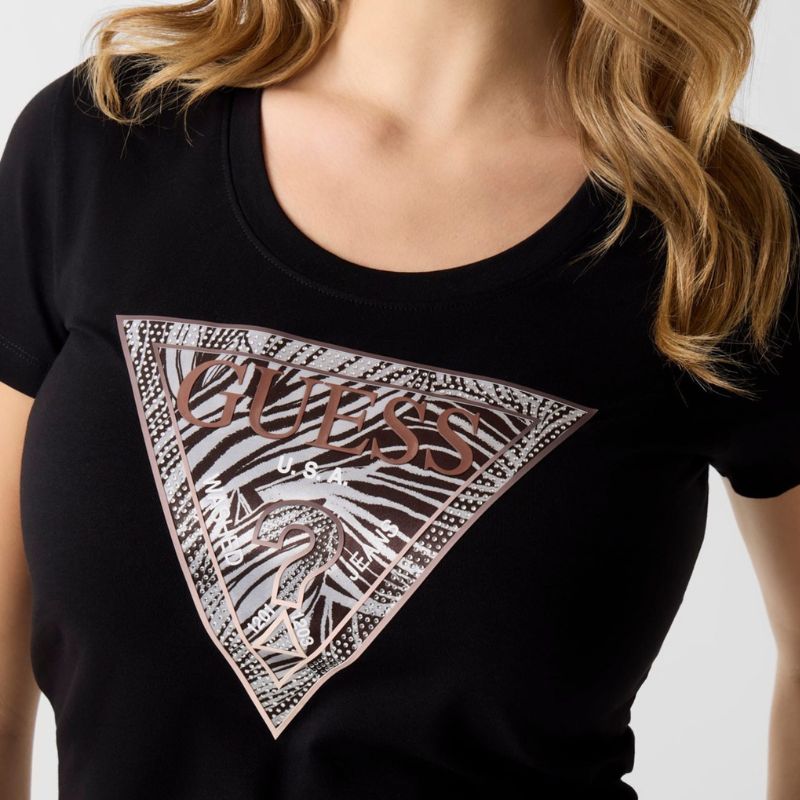 Rövid ujjú pamut póló, elején zebramintás nagy Guess háromszög logóval.