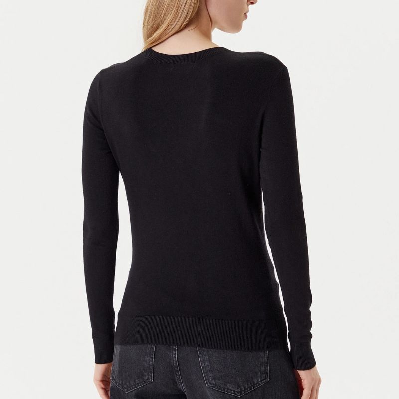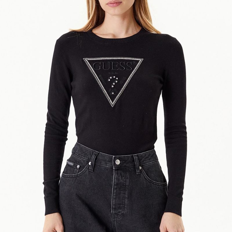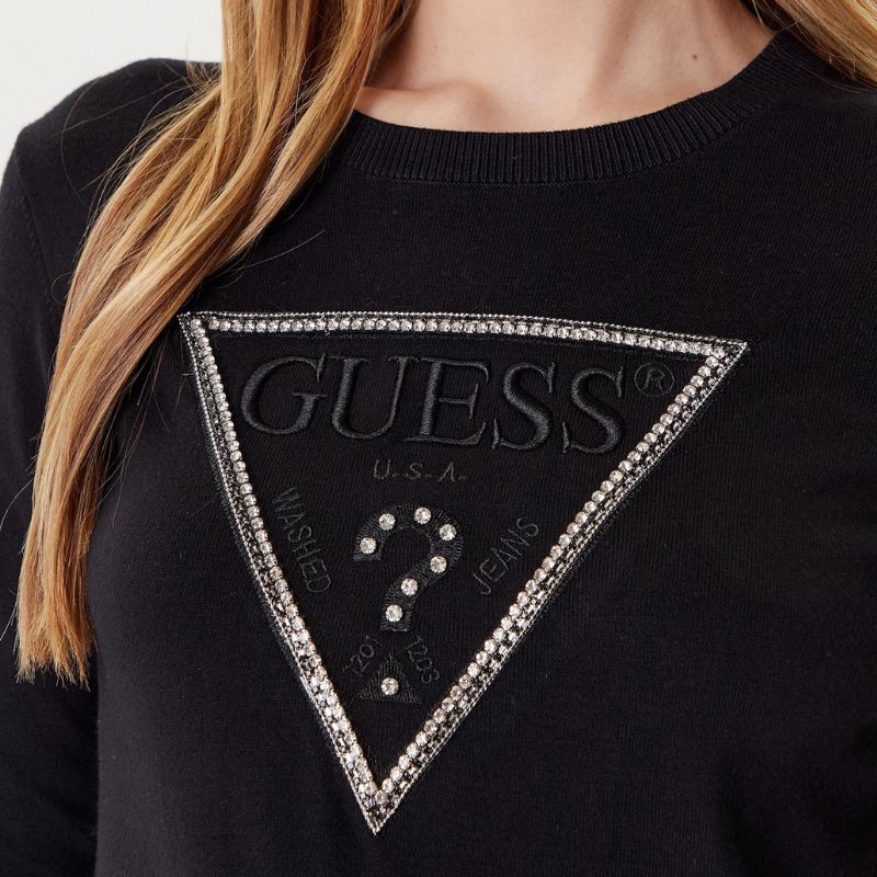 Rugalmas anyagú vékony kötött pulóver, elején strasszokkal kirakott nagy GUESS háromszög logóval.