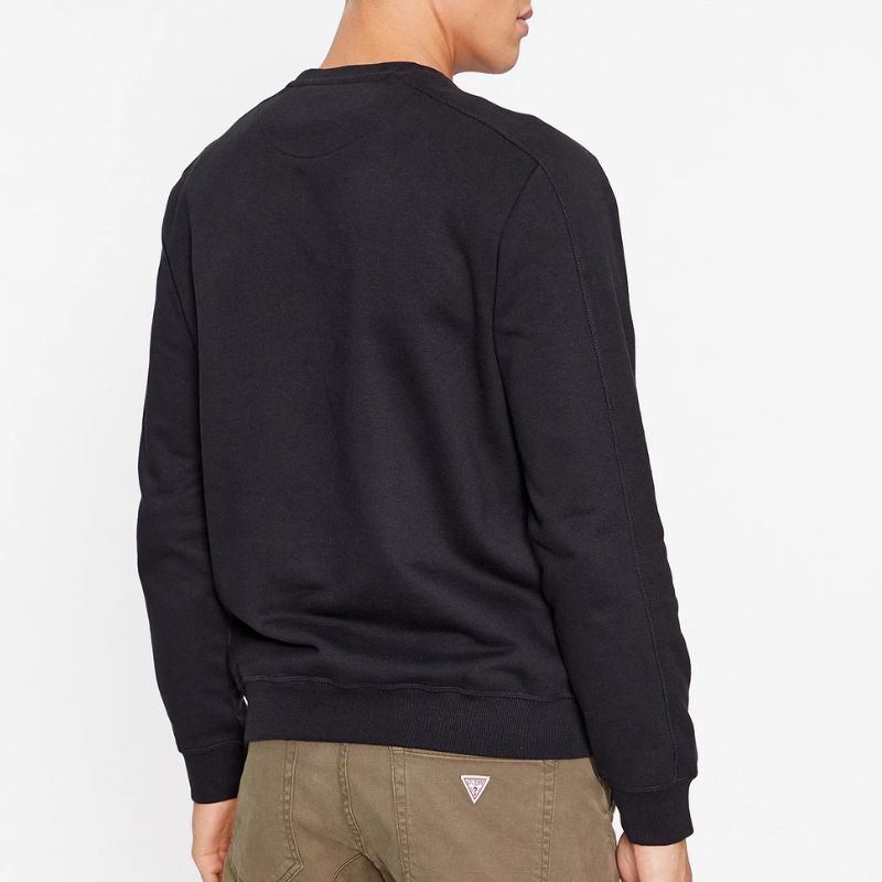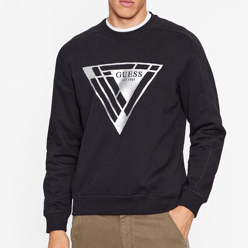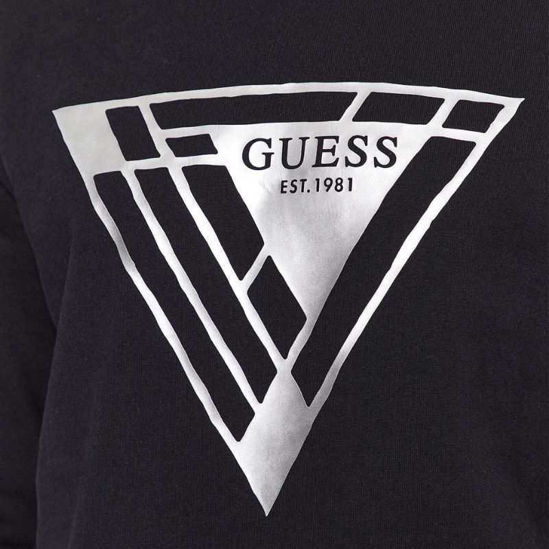 Fekete színű pulóver, elején ezüstös GUESS háromszög logóval.