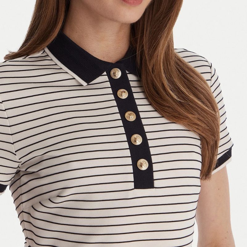 Testhezálló fekete-fehér csíkos midi ruha arany színű gombokkal.
