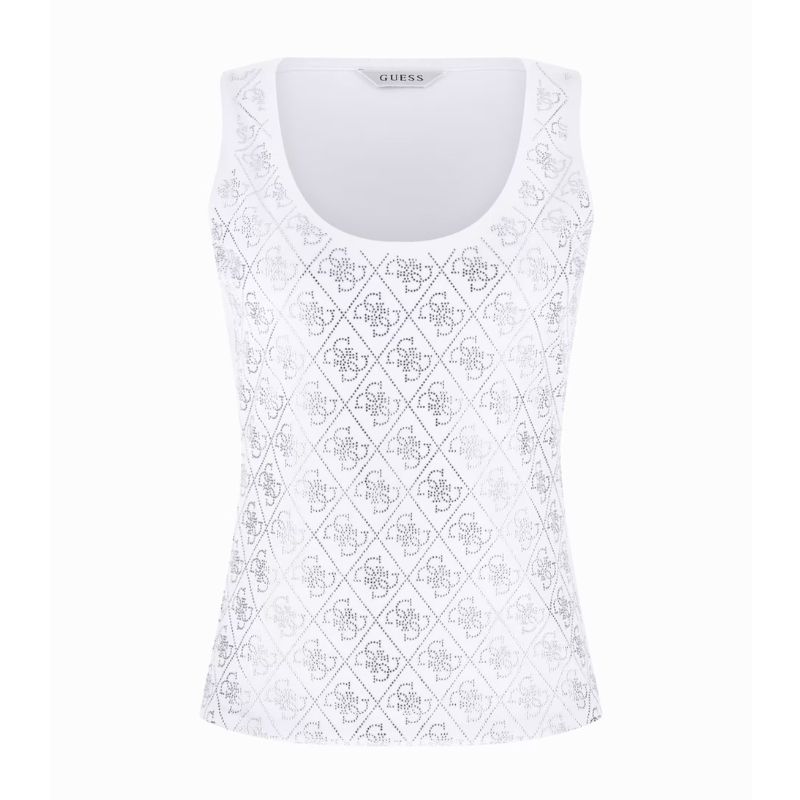 Elasztikus anyagú női ujjatlan top, elején strasszkövekkel kirakott 4G logókkal.
