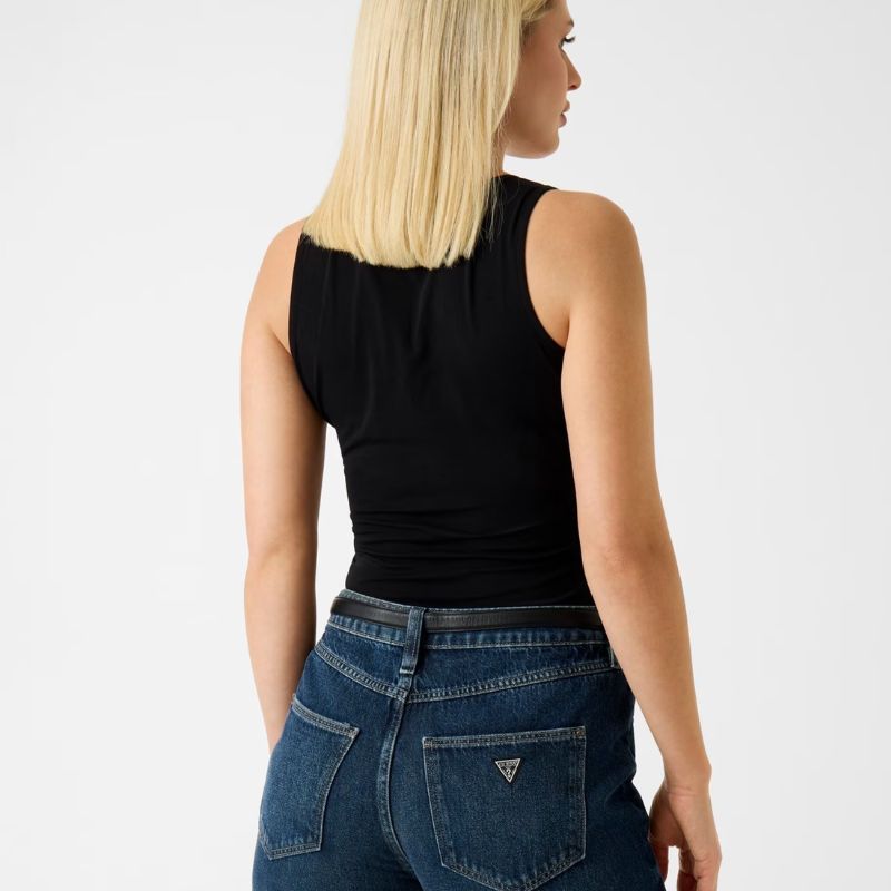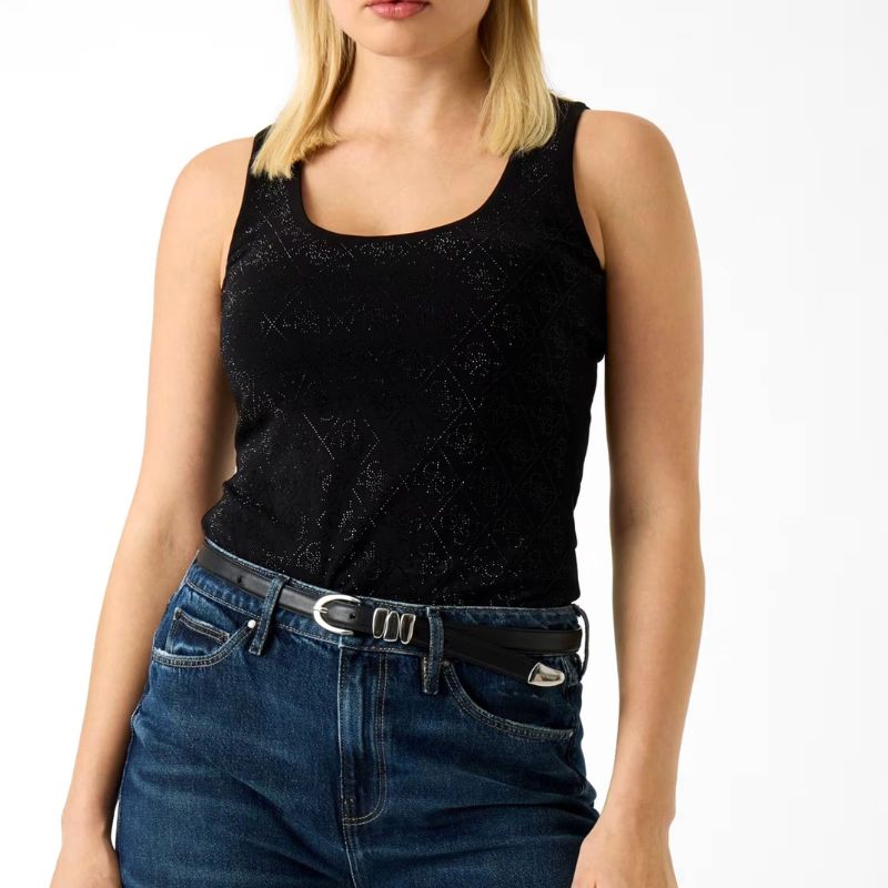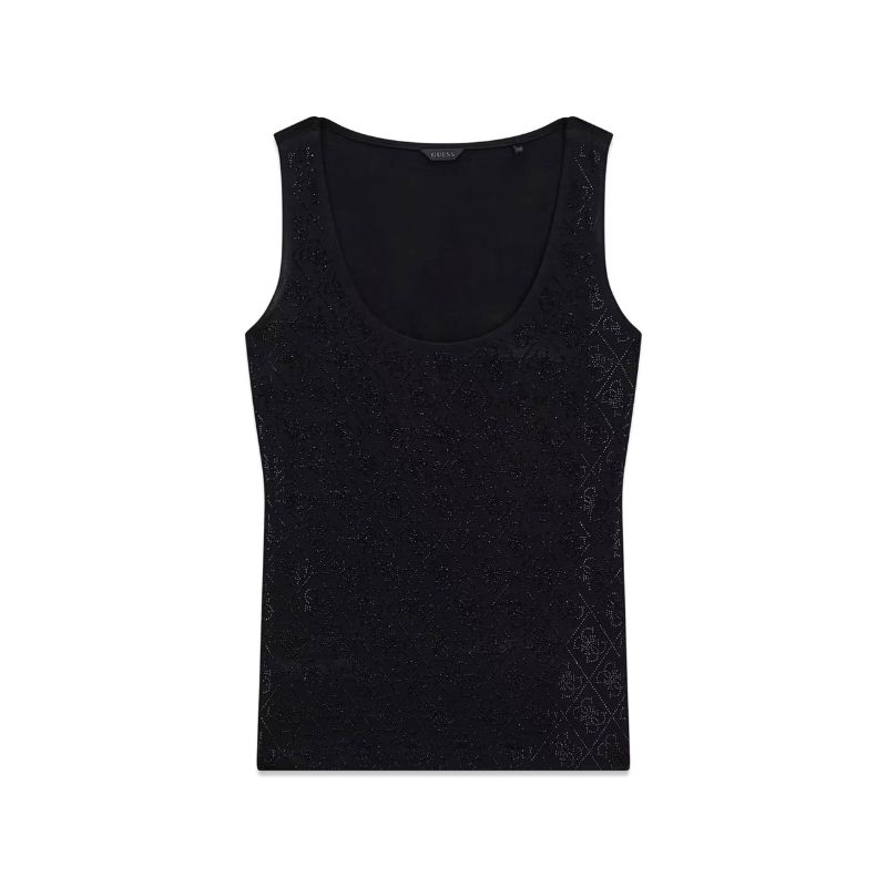 Elasztikus anyagú női ujjatlan top, elején strasszkövekkel kirakott 4G logókkal.