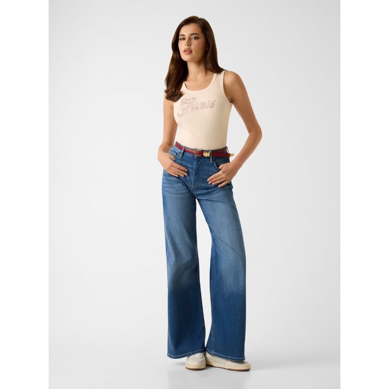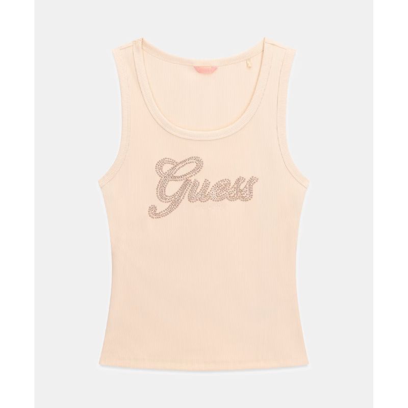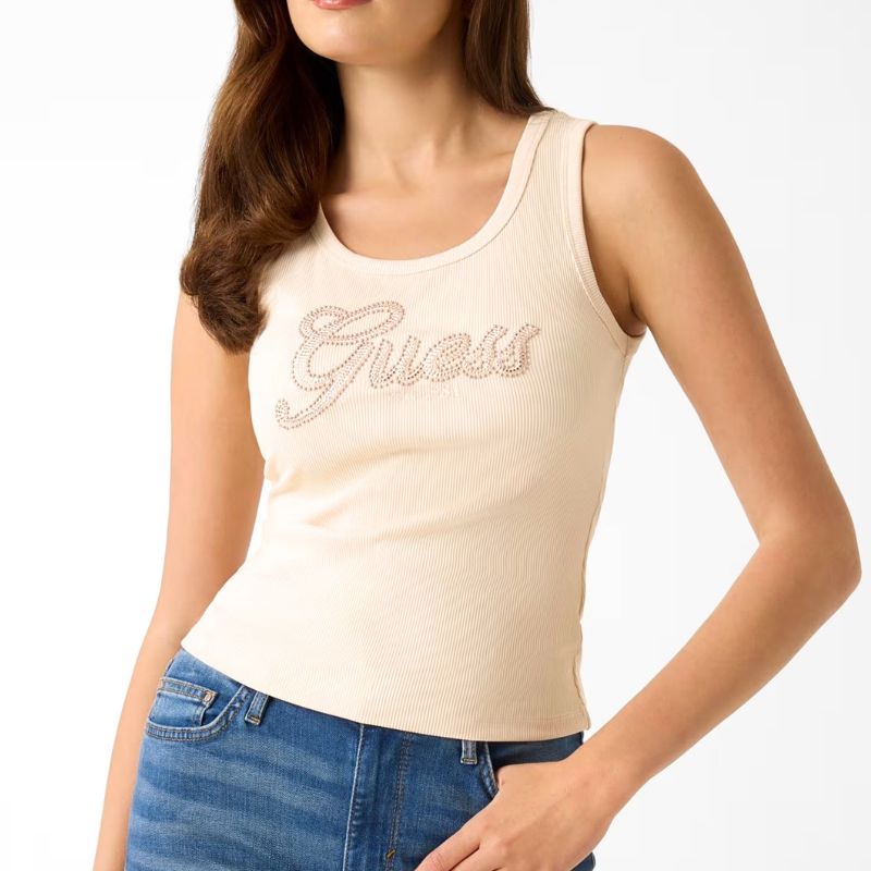 Selymes tapintású anyagból készült női trikó, elején strasszkövekkel díszített GUESS logóval.