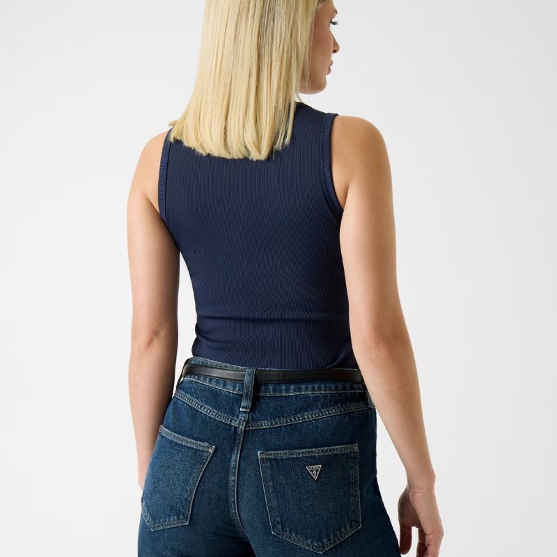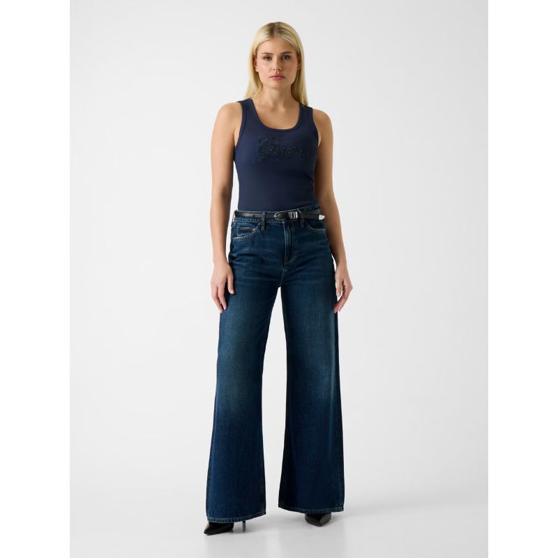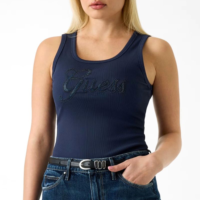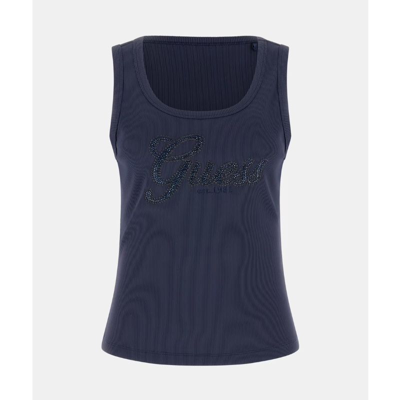 Selymes tapintású anyagból készült női trikó, elején strasszkövekkel díszített GUESS logóval.